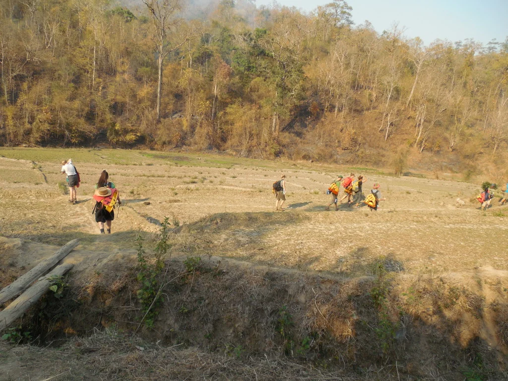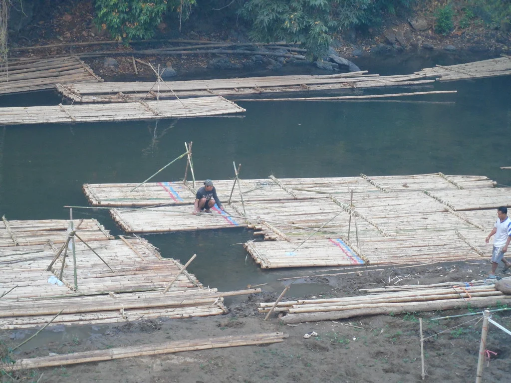 The photos below are from our trek- one through the dry rice paddies, one of our group in front of a herd of cattle and one of a local man working on our bamboo rafts!