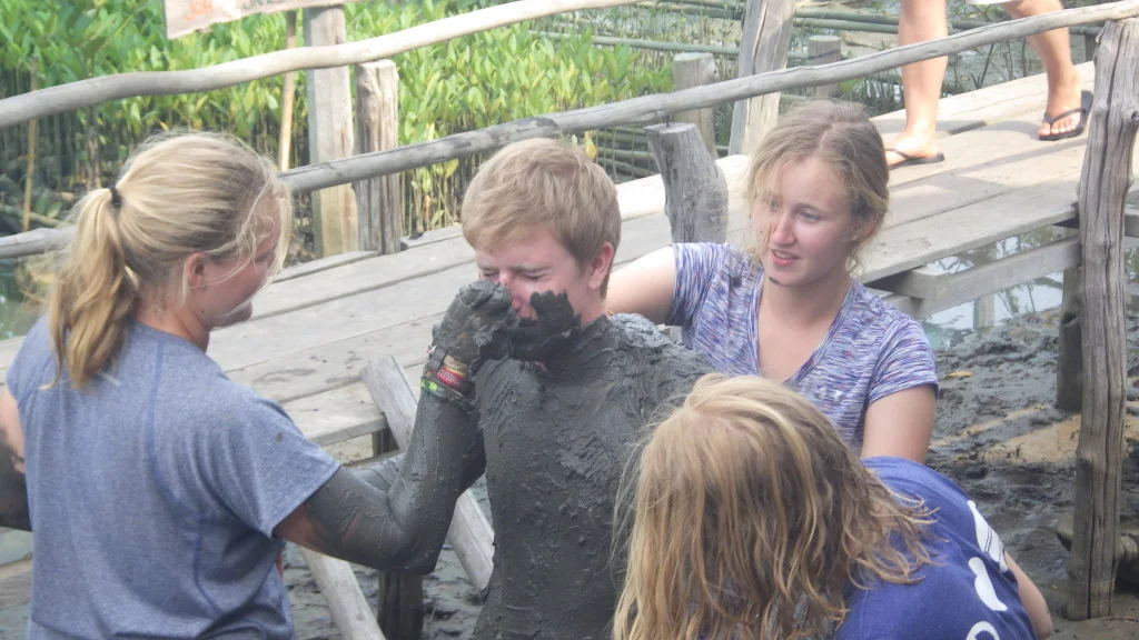 The mangrove project was located along a saltwater river. The buildings were on stilts along the river, bordering dried-up rice fields. It was stunningly beautiful, and we all welcomed the breeze that floated in from the river . We arrived at the site in the afternoon and immediately got to work. We were in charge of filling up plastic mud bags where mangrove seeds would be planted. Our work site was basically a mud pit beneath a building on stilts. As we worked, the river slowly began to ebb towards us. Naturally, when you put a bunch of 18-20 year olds in a mud pit, a mud fight will ensue. The work session ended with all of us covered in mud and huge smiles on our faces. The river was right next door, and we all jumped in to clean off.