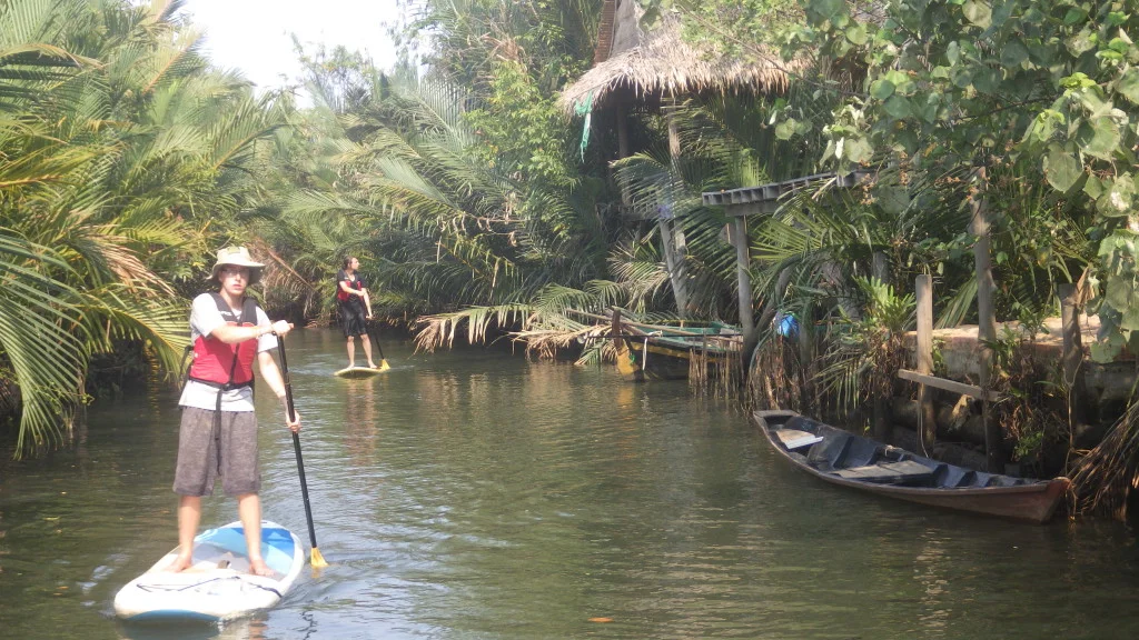Up next, we had a few days at SUP Asia, where we paddleboarded and Kayaked. When we got there on Monday, we paddleboarded (some of us kayaked) through the trees, seeing an interesting variety of plant life. The following day, we went to a pagoda, where we say around and talked on the paddle boards for half an hour in that stunning setting. That afternoon, we went on a boat ride to a beach, where everyone had some good relaxation time, or if your name is Phong, climbing banana trees. The next day, we big farewell to SUP Asia (who treated us very well btw), and we went to cross the Cambodian-Vietnam border! The trip started fine, albeit half an hour late due to a couple running late (or on Chris time as it’s been known this trip). An hour later, we were at the border. Some lady walked on to the bus, asking for our passports, which seemed rather suspect. However, to the recommendation of the other travelers, we gave them up, and within half an hour we were in Vietnam!