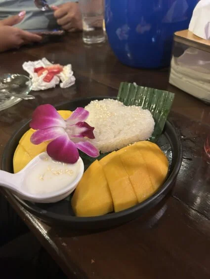 We went to a restruant last night for the first time, and bonded even more as a team over dinner. I (Nevaeh) have been making an active effort to try new foods on this trip and I know Anabelle wants to so I have been making it my job to nudge her to try every new food that we see. Last night she had Mango sticky rice for the first time and now I’m going to let her tell you all about that from her perspective!